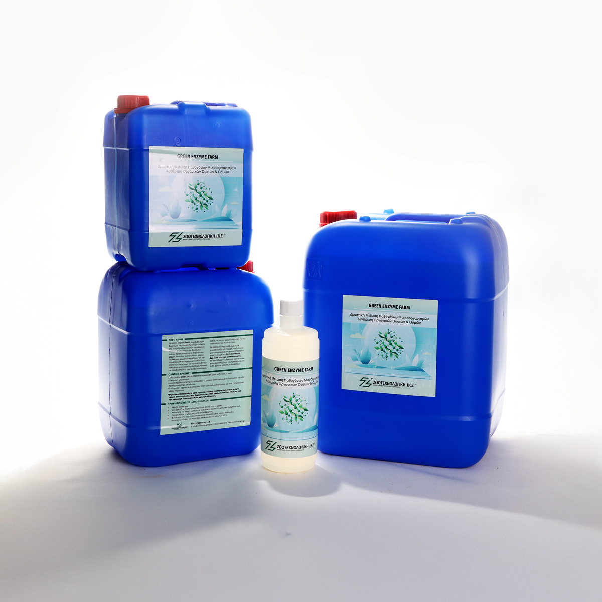Το GREEN ENZYME FARM είναι ένας υγρός βιολογικός ενεργοποιητής που αποτελείται από ένα μείγμα βακτηριακών καλλιεργειών, ενζύμων, ζυμoμυκήτων και θρεπτικών ουσιών. Χρησιμοποιείται σε στάβλους και φάρμες (βοοειδών, αιγοπροβάτων, χοίρων, πουλερικών, κουνελιών και αλόγων) για την εξουδετέρωση των οργανικών ουσιών, που αποτελούν υπόστρωμα για την ανάπτυξη των παθογόνων μικροοργανισμών (Σταφυλόκοκκοι και Κολοβακτηρίδια), των δυσάρεστων οσμών και των αναθυμιάσεων της αμμωνίας καθώς και για την αφομοίωση (πέψη) και την ρευστοποίηση των λυμάτων τους.