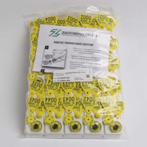 Η συσκευασία αποτελείται από διαφανή πλαστική σακούλα (μεγάλη 50 ζεύγη, μικρή 20 ζεύγη), ταμπέλα με το όνομα του κτηνοτρόφου, τον κωδικό της εκμετάλλευσής του, το πρώτο και το τελευταίο νούμερο της παραγγελίας του και τον συνολικό αριθμό και το είδος των ενωτίων αυτής. Σε περίπτωση που χρειάζονται περισσότερες από μία σακούλες για την παραγγελία, οι ταμπέλες αυτών αριθμούνται ανάλογα (π.χ. 1/3, 2/3, 3/3).