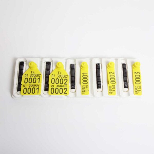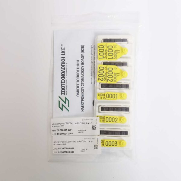 Η συσκευασία αποτελείται από διαφανή πλαστική σακούλα (μεγάλη 50 ζεύγη, μικρή 20 ζεύγη), ταμπέλα με το όνομα του κτηνοτρόφου, τον κωδικό της εκμετάλλευσής του, το πρώτο και το τελευταίο νούμερο της παραγγελίας του και τον συνολικό αριθμό βώλων και το είδος των ενωτίων αυτής. Σε περίπτωση που χρειάζονται περισσότερες από μία σακούλες για την παραγγελία, οι ταμπέλες αυτών αριθμούνται ανάλογα (π.χ. 1/3, 2/3, 3/3).